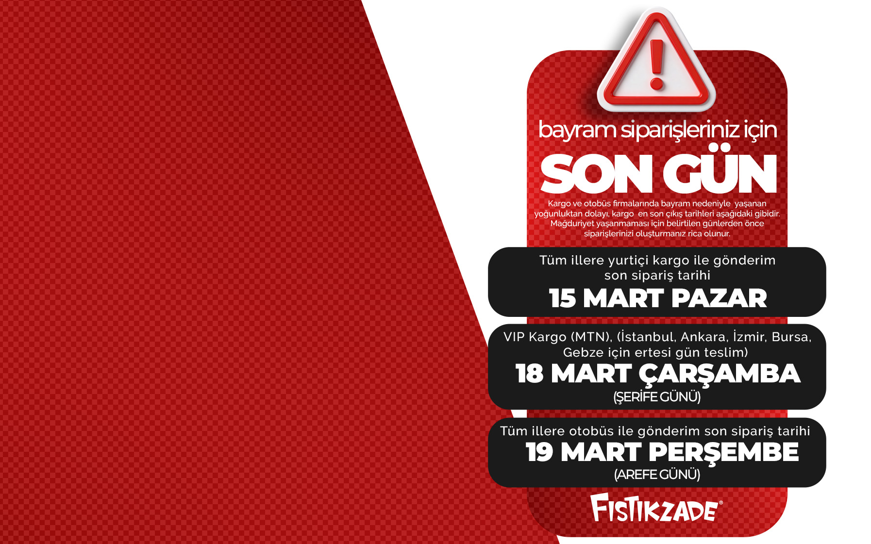 Tüm Fıstıkzade lezzetleri en doğal malzemeler ile üretilir. Aynı gün kargoya verilir.