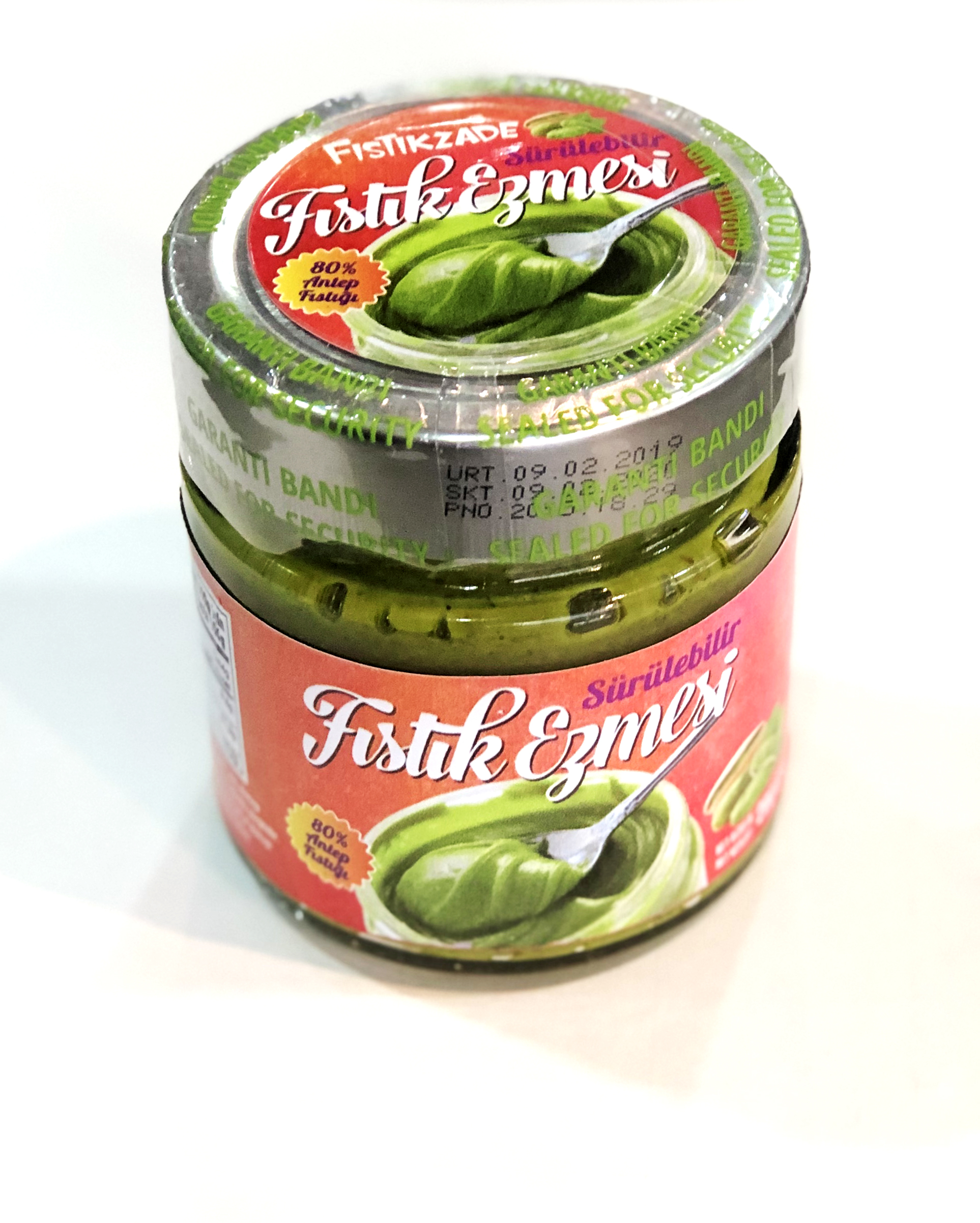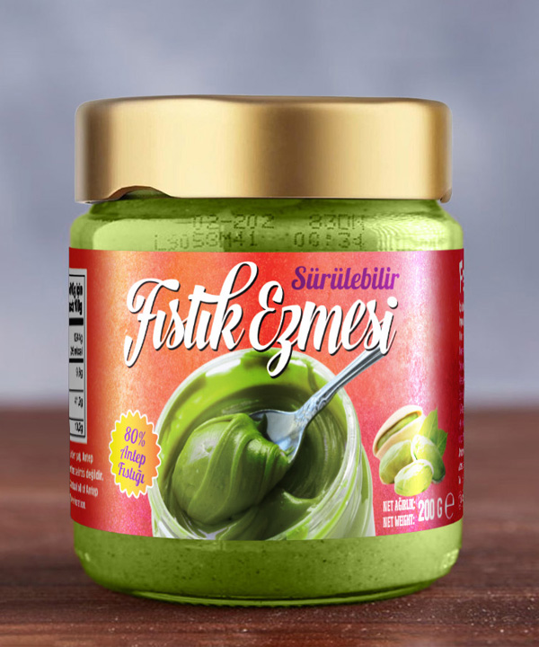 80% Oranında boz antep fıstığı, fıstığın kendi yağı ve şeker ile üretilmiş, katkı maddesi ve koruyucu içermeyen kahvaltılık sürülebilir antep fıstığı ezmesi.